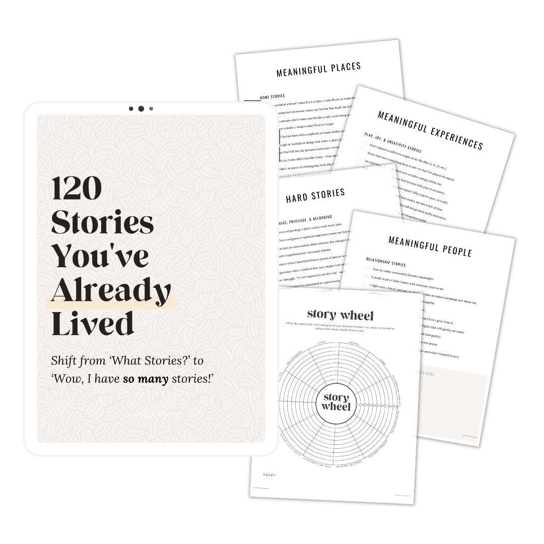 120 Stories You’ve Already Lived is a free guide to help you see what’s been there all along. Inside: 120 prompts to get stories out of your body and onto the page.